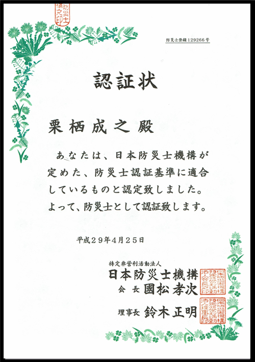 ShiGezoneの代表である「栗栖 成之」は、防災士の資格を有しています。