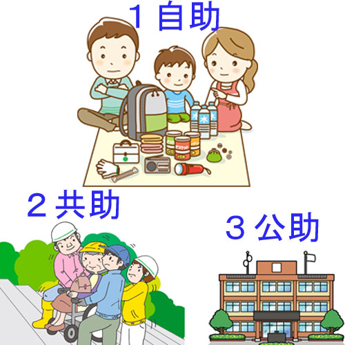 3:公助 ⇒ 市役所などによる救助活動や支援物資の提供など、公的支援のこと