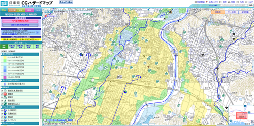 兵庫県CGハザードマップは、土砂災害・洪水・津波・ため池・高潮の全ての危険個所を確認できるツールです。公的避難所も確認することができます。